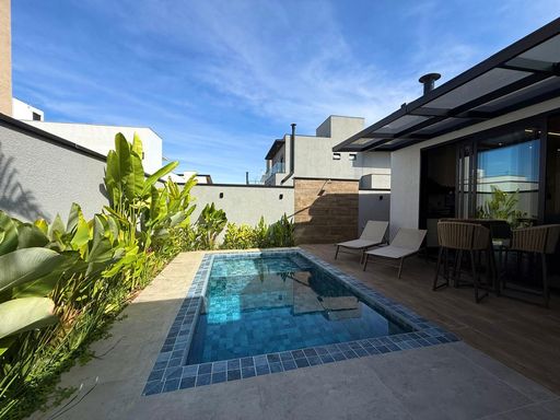 Casa assobradada com 3 dormitórios sendo 3 suítes, lavabo, cozinha, despensa, lavanderia coberta e isolada, espaço gourmet integrado com piscina, banheiro social, box para guardar objetos, 4 vagas sendo 2 cobertas. Acabamento: Pé direito duplo, revestimento em porcelanato exceto área externa, banheiros com revestimento até o teto, quarto máster com closet e janelas automatizadas, cozinha com bancada em mármore São Gabriel, churrasqueira, forno de pizza/pão, piscina 10 mil litros com cascata.