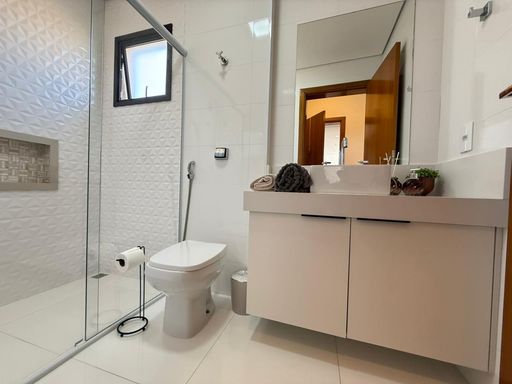 A casa conta com 3 suítes, sendo a suíte master um verdadeiro refúgio, equipada com closet e banheira, perfeita para momentos de relaxamento. Além disso, possui escritório (ideal para home office), lavabo e ambientes amplos, bem distribuídos e integrados.