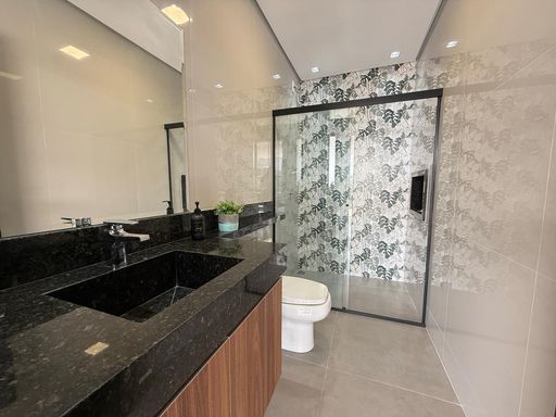 No pavimento inferior, o destaque fica por conta da área gourmet espaçosa, da piscina com prainha e do paisagismo, ambiente ideal para aproveitar os momentos de lazer. Além disso, esse espaço conta também com quarto adicional (ideal para hóspedes ou escritório) e banheiro social.
