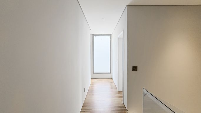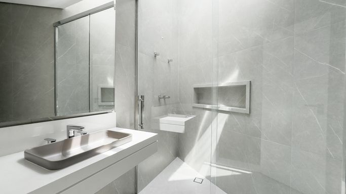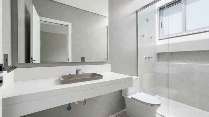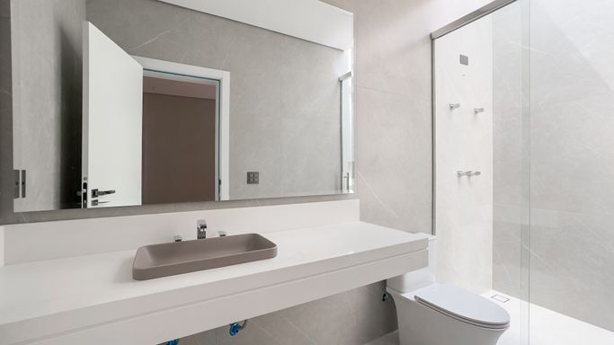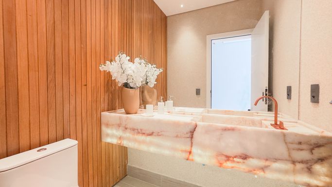 Nos detalhes, o imóvel surpreende: lavabo com bancada em ônix iluminado, escada e banheiros com mármore quartzo, espelhos com iluminação em LED e esquadrias automatizadas, reforçando o padrão elevado da construção.