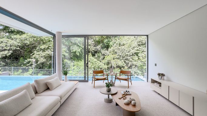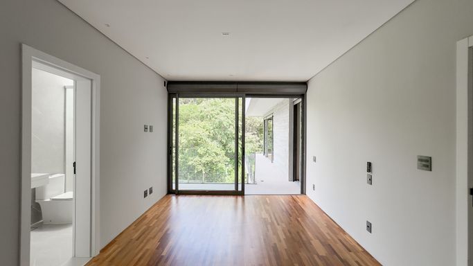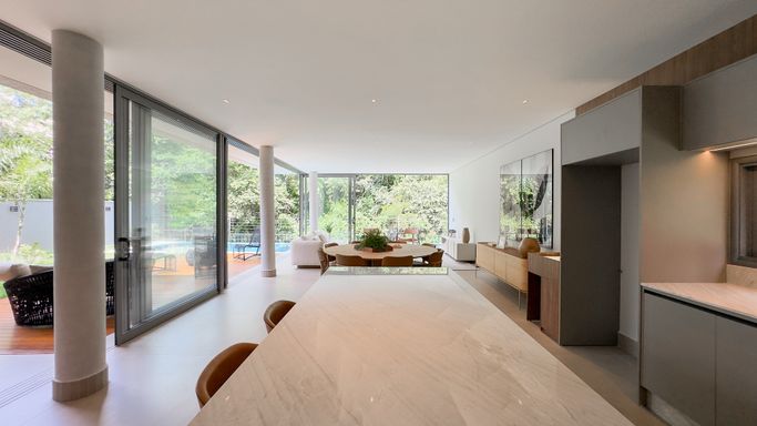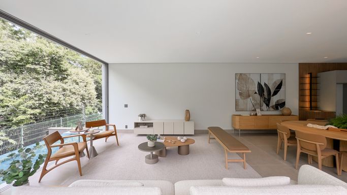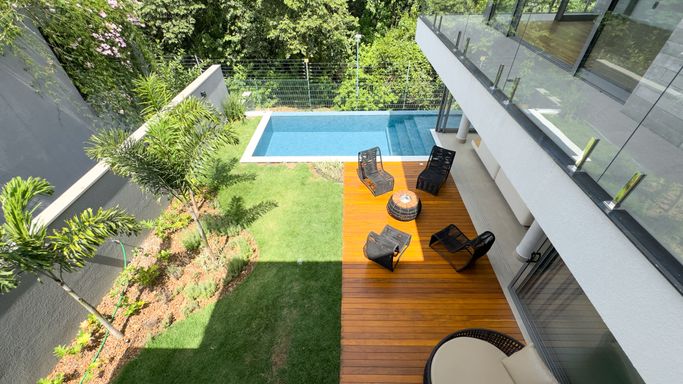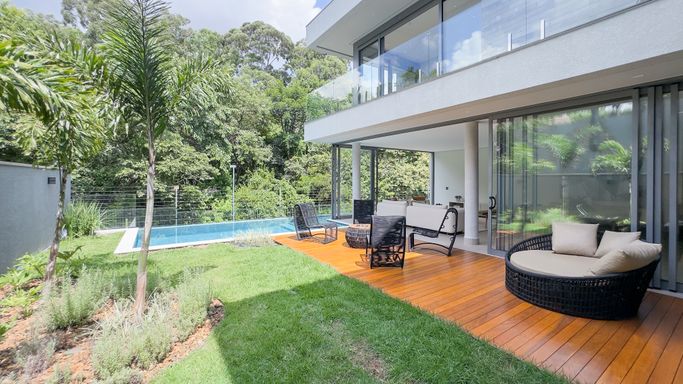 A área externa é um convite ao lazer: piscina totalmente privativa, com preparação para aquecimento e iluminação em LED, deck em madeira cumaru e vista permanente para a mata. Um cenário perfeito para momentos de descanso e confraternização.