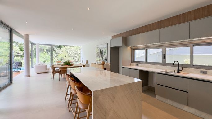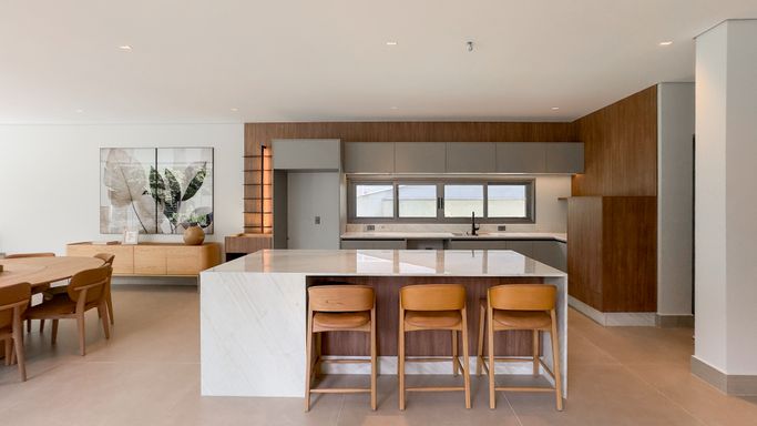 As áreas sociais se destacam pelo pé-direito imponente e pela integração entre sala de estar, cozinha e espaço gourmet, todos revestidos com porcelanato de grandes formatos (1,20 x 1,20). A cozinha e a área gourmet contam com mármore Taj Mahal, armários planejados e excelente aproveitamento de espaço, ideais para quem valoriza design e praticidade.
